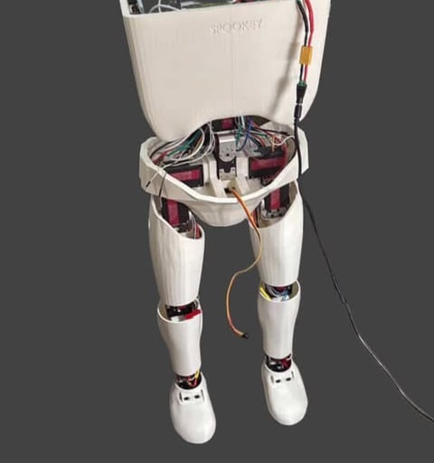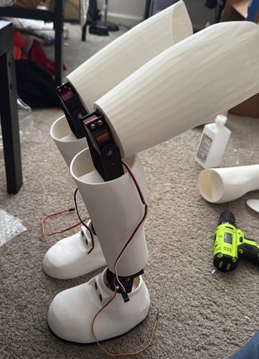All physical components of the body are 3D printed using standard PLA filament in either white or black. Each thigh, shin, and shoe weighs approximately 250 grams. Including all internal components and servos, a single leg has a total weight of about 1 kilogram.
